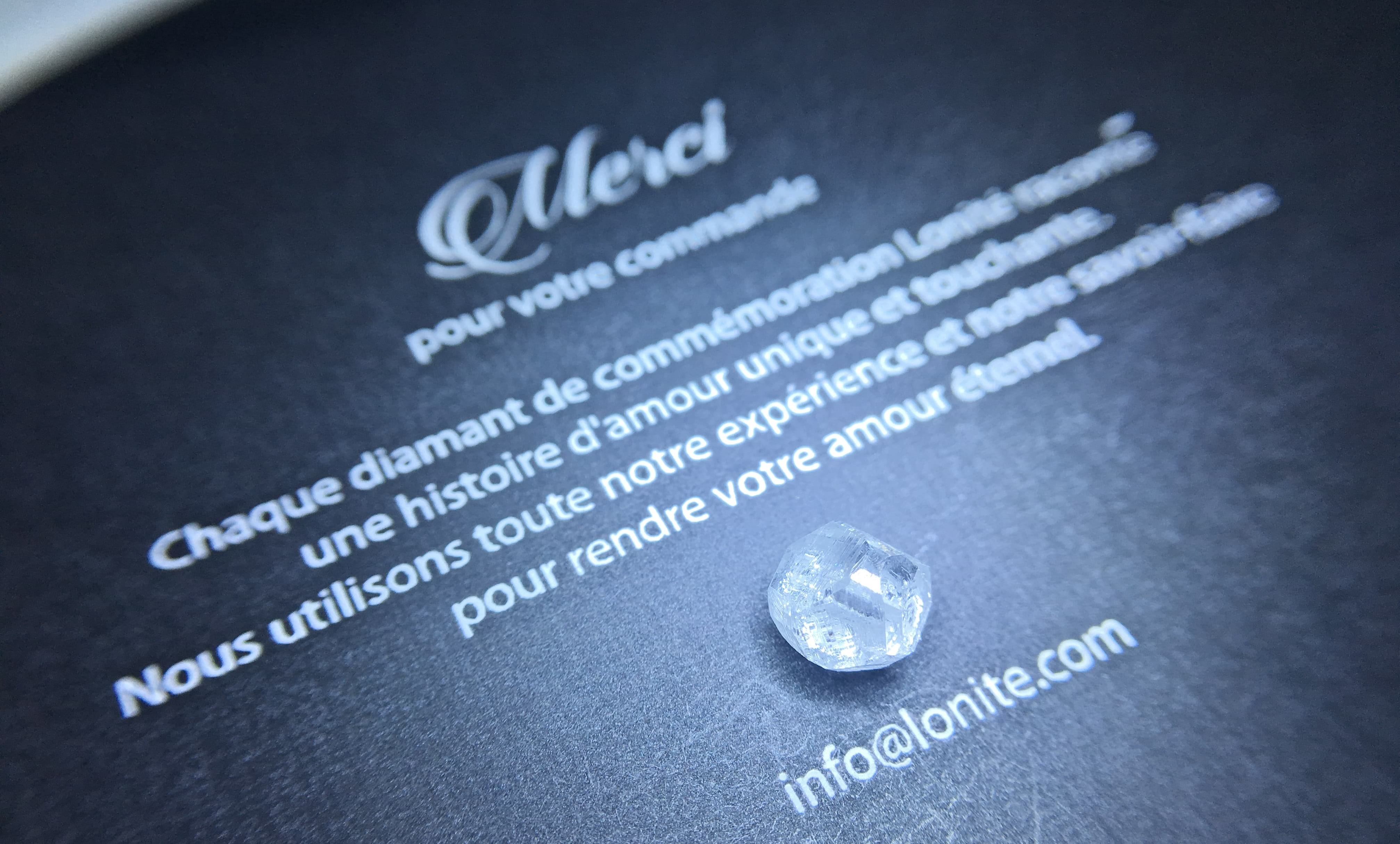 Cada diamante con pelo o plumas de mascotas en España, y de hecho todos los diamantes con cenizas de perros, gatos, caballos y aves elaborados por LONITÉ, se acompañan de un Certificado de Origen y un Informe de Análisis del Material.