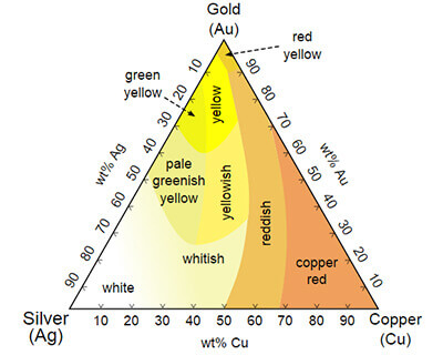 En su forma natural, el oro es claramente amarillo. Sin embargo, en algunos accesorios o joyas, el tono amarillo puede ser demasiado abrumador y crea un contraste muy fuerte para la mayoría de las joyas. Para crear más variedad, el oro se mezcla con otros metales a fin de crear aleaciones con diferentes tonalidades. Dependiendo de los metales agregados, el oro puede venir en una variedad de colores que incluyan tonos de amarillo, blanco y rosa.